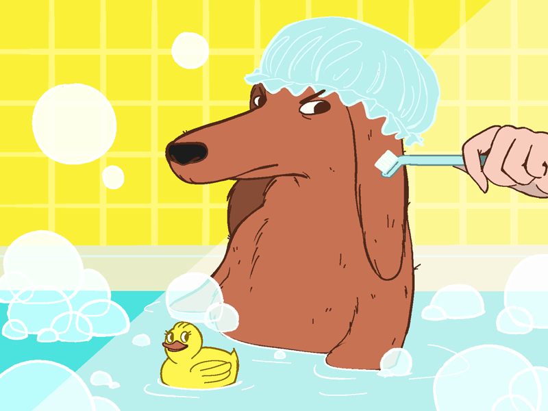 the sketches for this piece were meant to place dogs in human child positions. The client preferred the first sketch but felt like the dog should be put in a more likely situation so we settled on placing the pup in a bath.