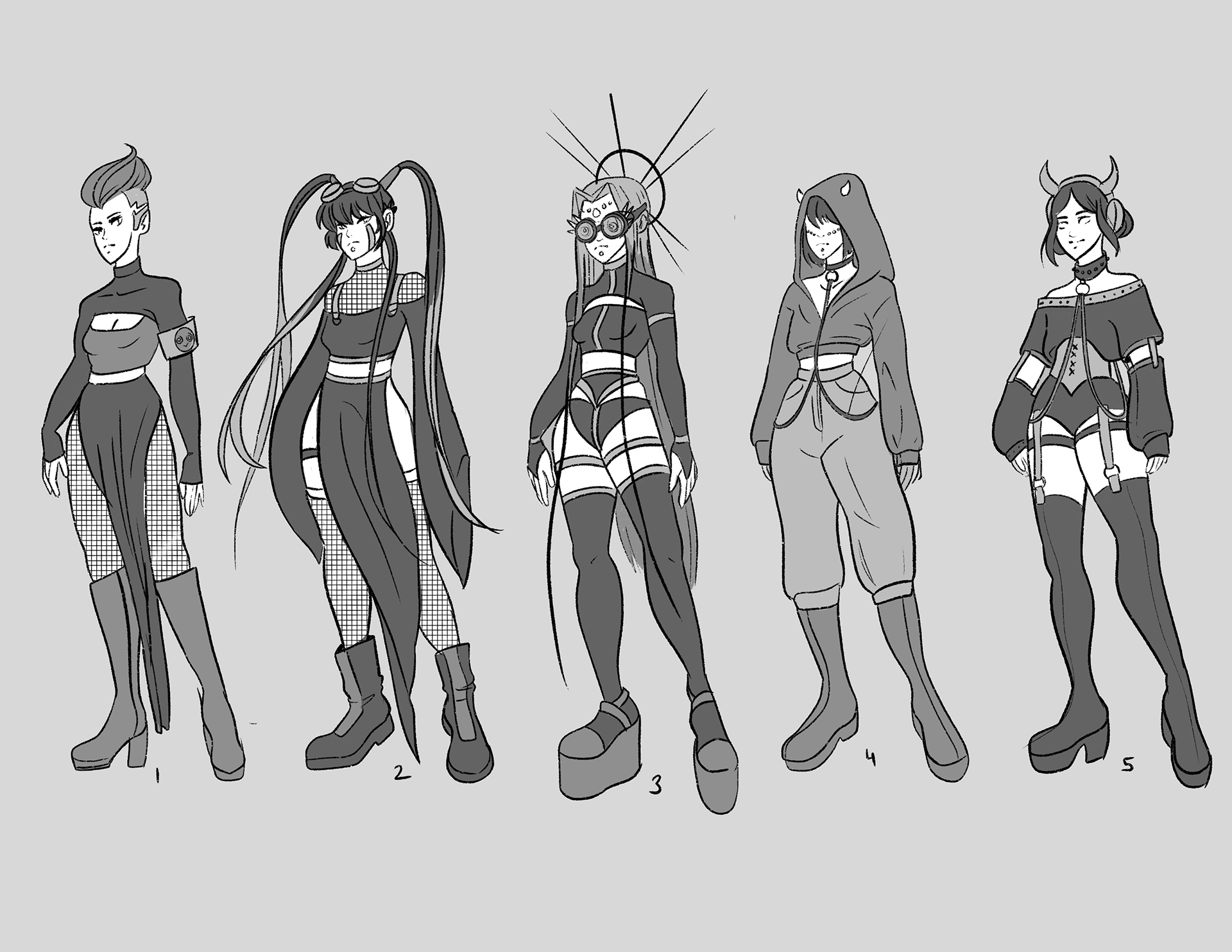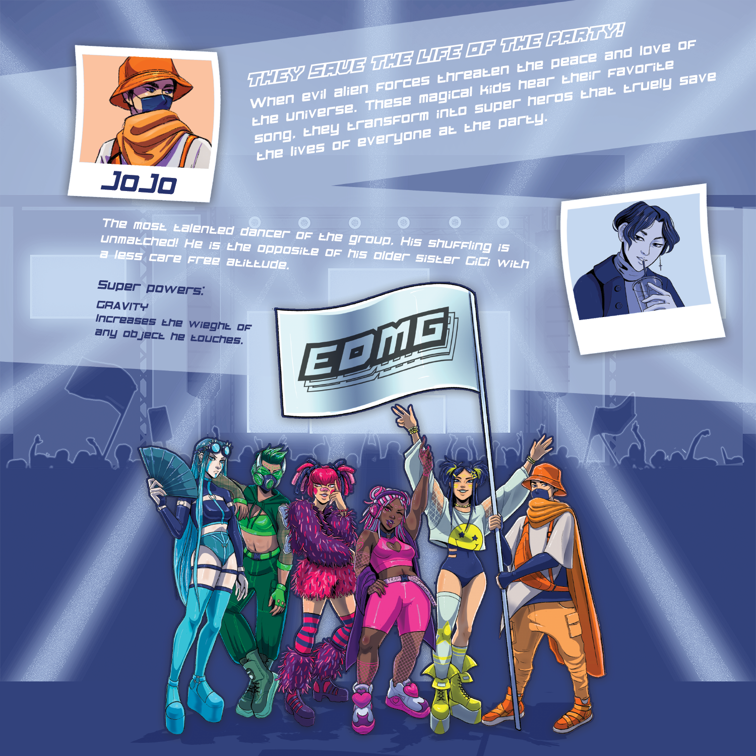 You would think that being the eldest of the group would make her mature, but GiGi prioritizes fun and does not take anything too seriously. She is Korean and her powers counter her younger brother JoJo's with anti-gravity. Meaning she can make any object weightless. I went with look 3 because I enjoyed the silhouette the most and I wanted to push it even more by exaggerating the boots and sleeves. Her look is a nod to artists like Fisher and Chris Lake.