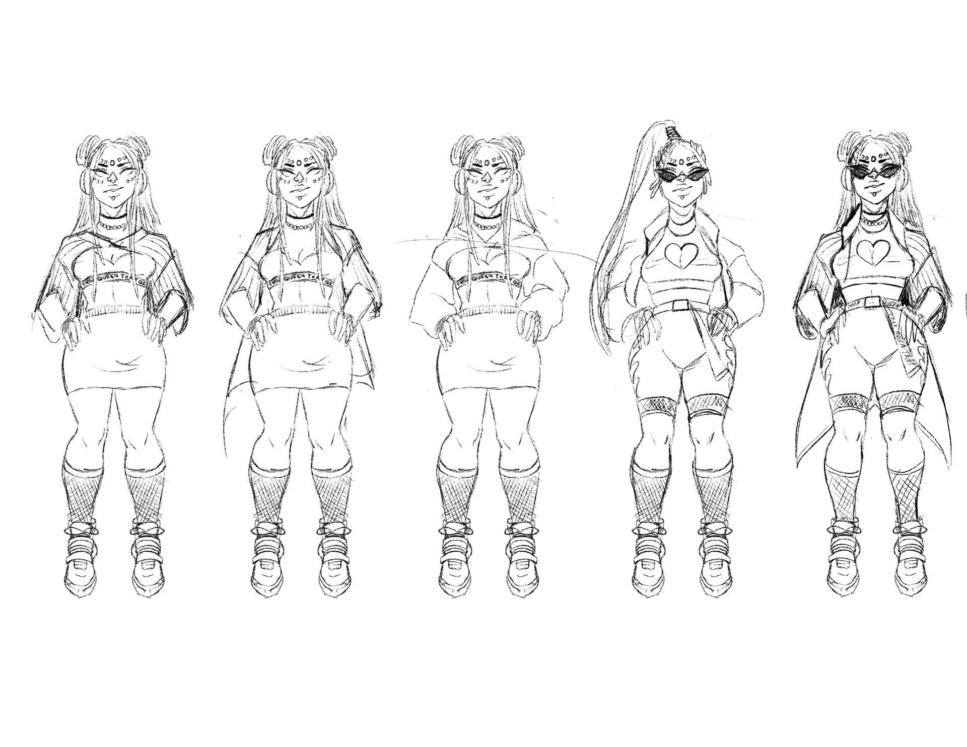 Bianca is confident, positive, and cunning. Her powers are Vibrokinesis, meaning she can send out earth shaking vibrations using her mind. Artists that influenced her are Alison Wonderland and Troyboy. I leaned towards design 4, and added the baseball jersey because of its popularity in rave culture. The shoes and belt are influenced by hype beast fashion items like Off White belts and chunky sneakers.