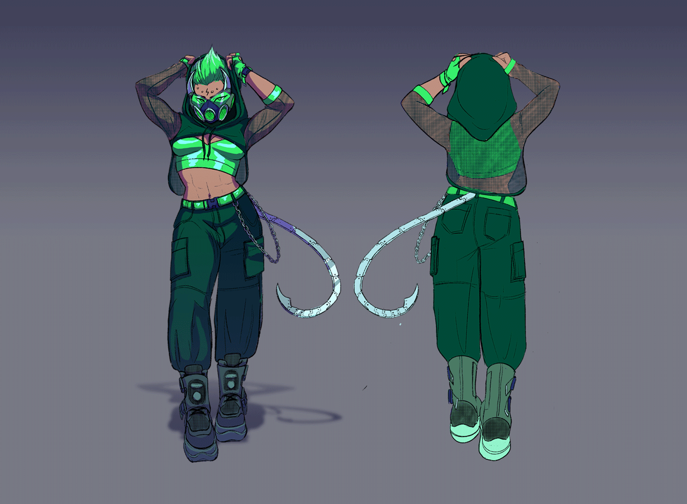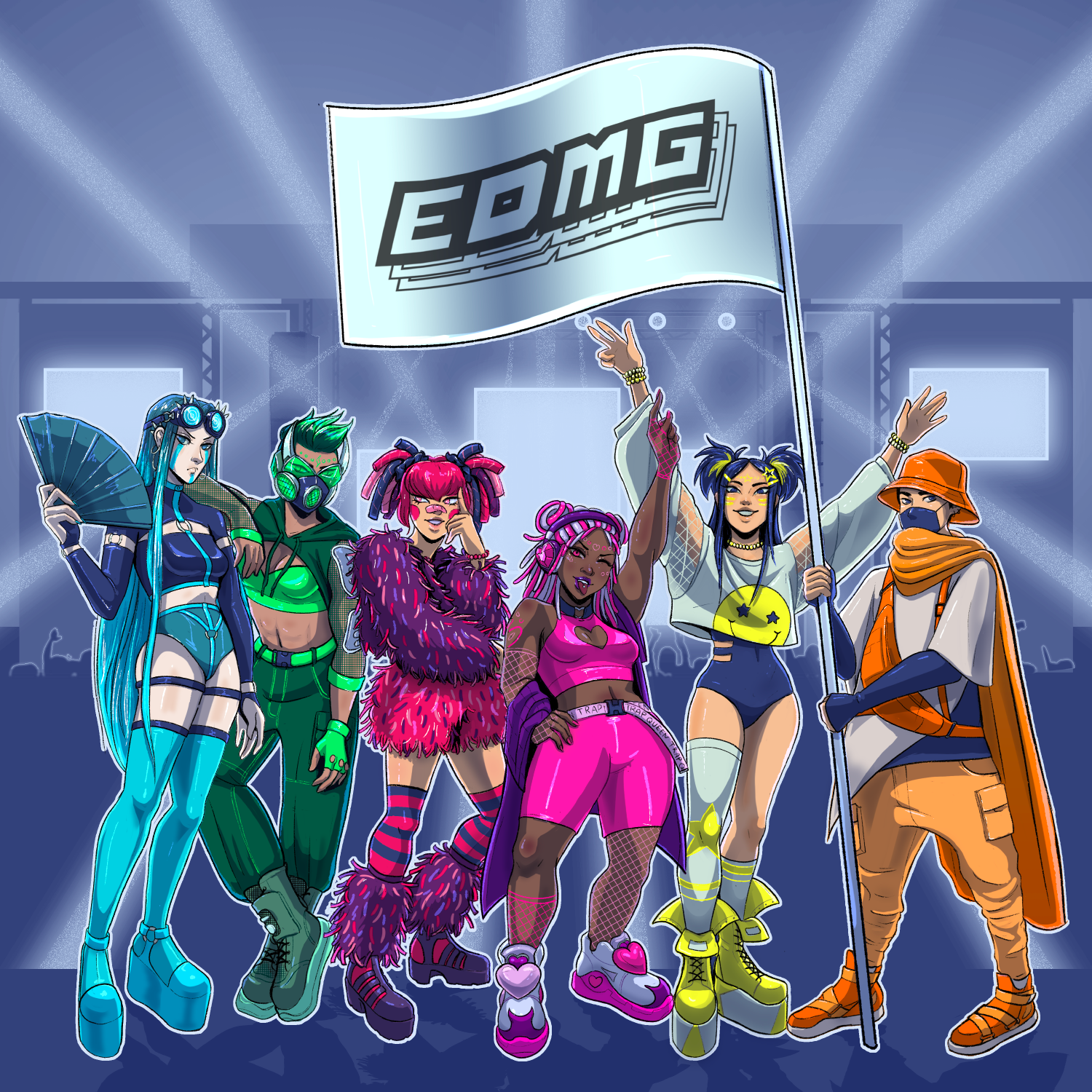 Vee is the brains of the group. She is sassy and a little quiet. She keeps the group in check but is also not afraid of letting loose once in a while. Her powers are hypnosis. The goggles light up in patterns that induce a hypnotic state. Since the genre is darker and more experimental I wanted her design to be more witch like. The goggles are inspired by the glitch hop DJ Rezz.